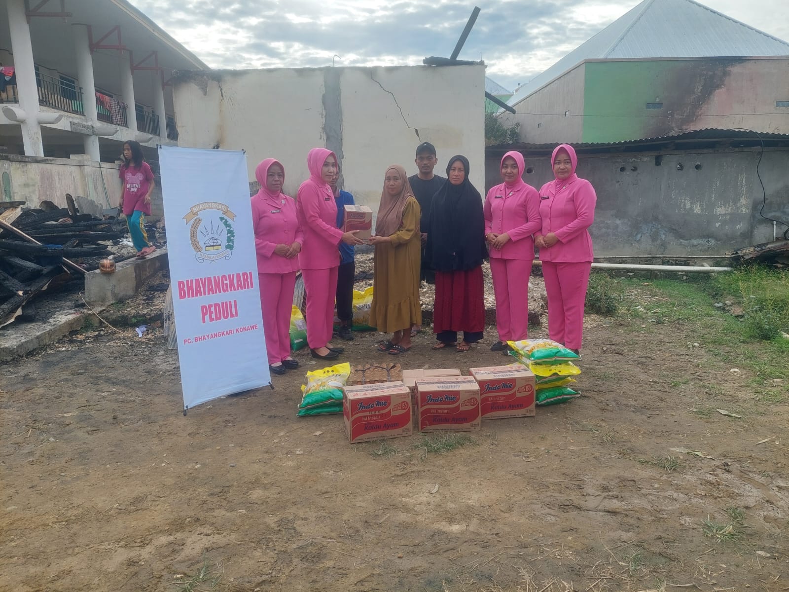 Adapun bantuan yang disalurkan berupa kebutuhan pokok, meliputi beras sebanyak 10 karung ukuran 5 kilogram, mie instan 4 dos, telur ayam 4 rak, serta minyak goreng kemasan 1 liter sebanyak 12 bungkus.