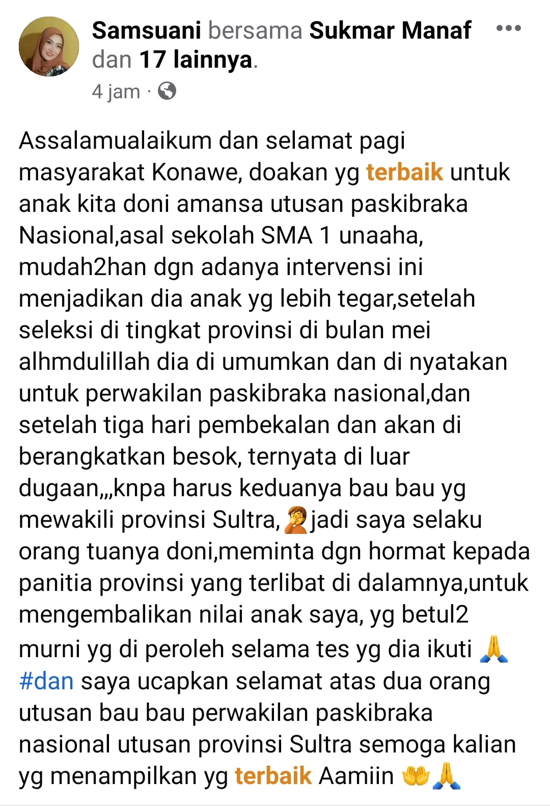 “Assalamualaikum dan selamat pagi masyarakat Konawe, doakan yg terbaik untuk anak kita doni amansa utusan paskibraka Nasional,asal sekolah SMA 1 unaaha, mudah2han dgn adanya intervensi ini menjadikan dia anak yg lebih tegar,setelah seleksi di tingkat provinsi di bulan mei alhmdulillah dia di umumkan dan di nyatakan untuk perwakilan paskibraka nasional,dan setelah tiga hari pembekalan dan akan di berangkatkan besok, ternyata di luar dugaan,,,knpa harus keduanya bau bau yg mewakili provinsi Sultra, 🤦jadi saya selaku orang tuanya doni,meminta dgn hormat kepada panitia provinsi yang terlibat di dalamnya,untuk mengembalikan nilai anak saya, yg betul2 murni yg di peroleh selama tes yg dia ikuti#dan saya ucapkan selamat atas dua orang utusan bau bau perwakilan paskibraka nasional utusan provinsi Sultra semoga kalian yg menampilkan yg terbaik Aamiin 🤲🙏,” tulis Samsuani di akun Facebook miliknya.