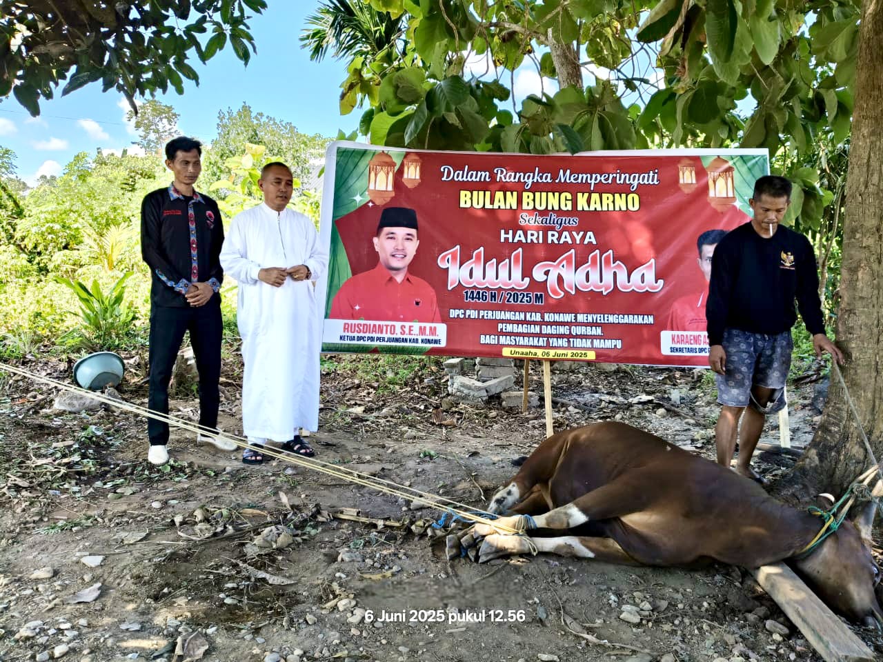 TINDO.ID | KONAWE – Memaknai Hari Raya Idul Adha 1446 Hijriah/2025 Masehi, Dewan Pimpinan Cabang (DPC) PDI Perjuangan Kabupaten Konawe menyembelih satu ekor sapi sebagai wujud kepedulian sosial kepada masyarakat, khususnya warga kurang mampu di Kelurahan Tuoy, Kecamatan Unaaha.