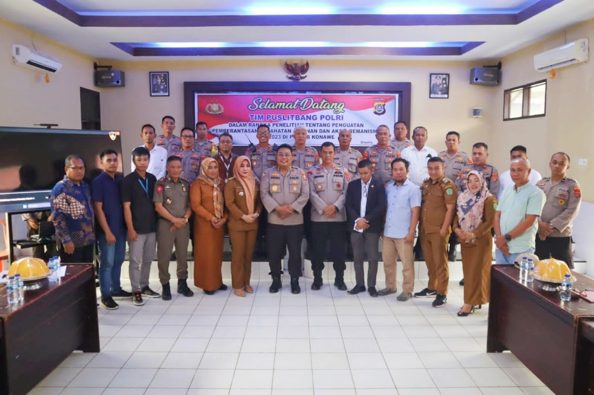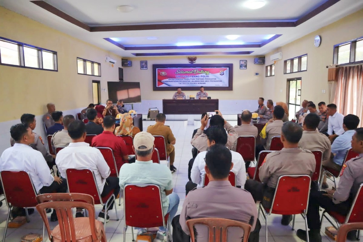 TINDO.ID | KONAWE – Tim Pusat Penelitian dan Pengembangan (Puslitbang) Polri melaksanakan kegiatan penelitian tentang penguatan pemberantasan kejahatan jalanan dan aksi premanisme tahun 2023 di Mako Polres Konawe, Senin 31 Juli 2023.
