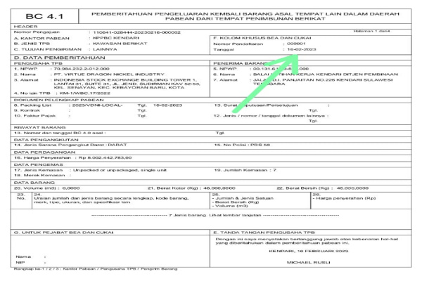 Ia mencontohkan pengeluaran alat berat dan mesin otomotif dari KB PT VDNI yang dihibahkan ke Balai Pelatihan Kerja (BLK) Kendari pada 16 Februari 2023. Menurutnya, proses tersebut dilengkapi dokumen resmi berupa Formulir BC 4.1. Namun, berbeda dengan pengeluaran limbah kabel produksi dari kawasan yang sama, yang disebutnya tidak dilengkapi dokumen apa pun.
