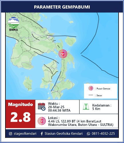 TINDO.ID | BUTUR – Sebuah gempa bumi tektonik dengan kekuatan Magnitudo 2,8 Skala Richter (SR) mengguncang Kabupaten Buton Utara (Butur), Sulawesi Tenggara (Sultra), pada Jumat (28/3/2025) pukul 00.44 WITA.