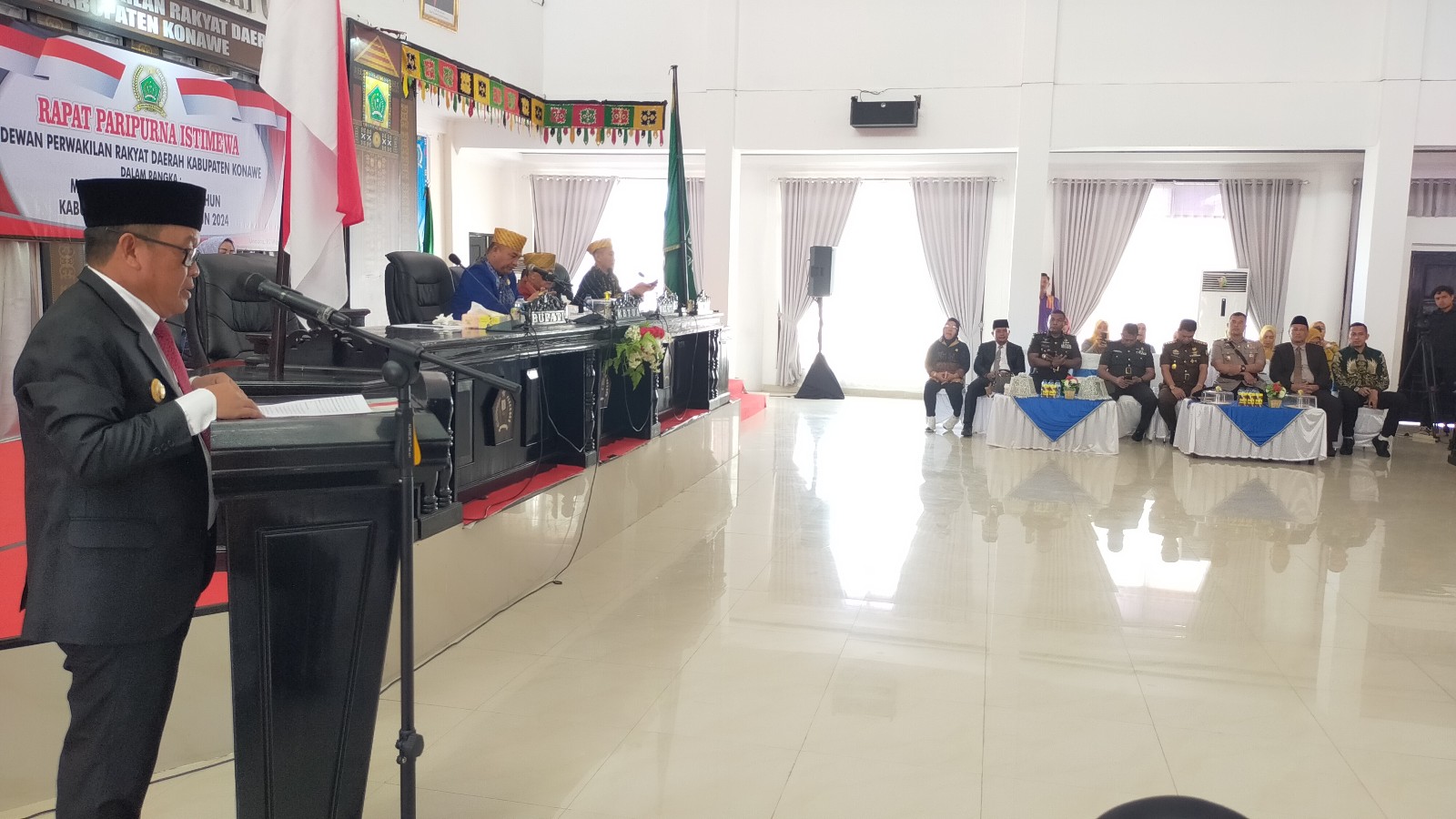 TINDO.id | KONAWE – Penjabat Bupati Konawe Dr. H. Harmin Ramba, SE, MM menghadiri Rapat Paripurna Istimewa dalam rangka memperingati Hari Ulang Tahun (HUT) Kabupaten Konawe ke -64 Tahun 2024, Sabtu 2 Maret 2024 di Gedung H. Abdul Samad, DPRD Konawe.