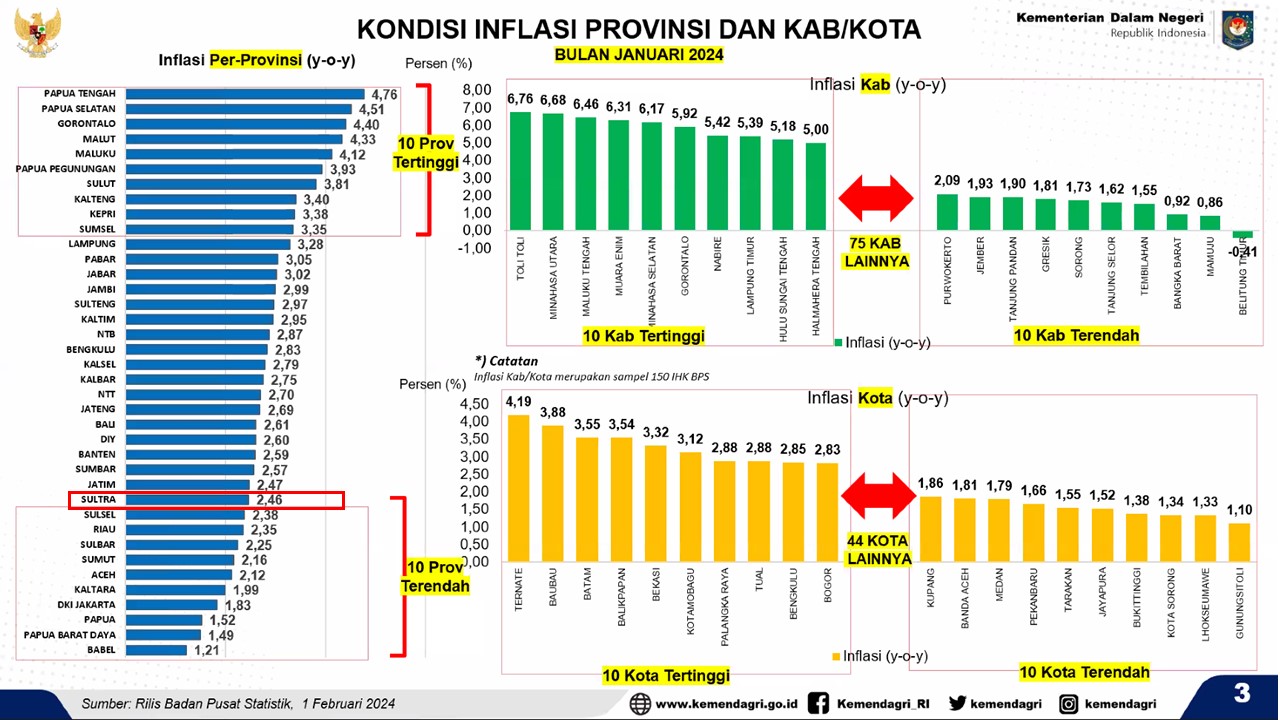“Sultra hebat. Inflasi year on year di bawah nasional dan month to month 0,03 persen atau deflasi,” ujar Mendagri M. Tito Karnavian saat BPS rilis berita resmi Statistik awal Februari lalu.