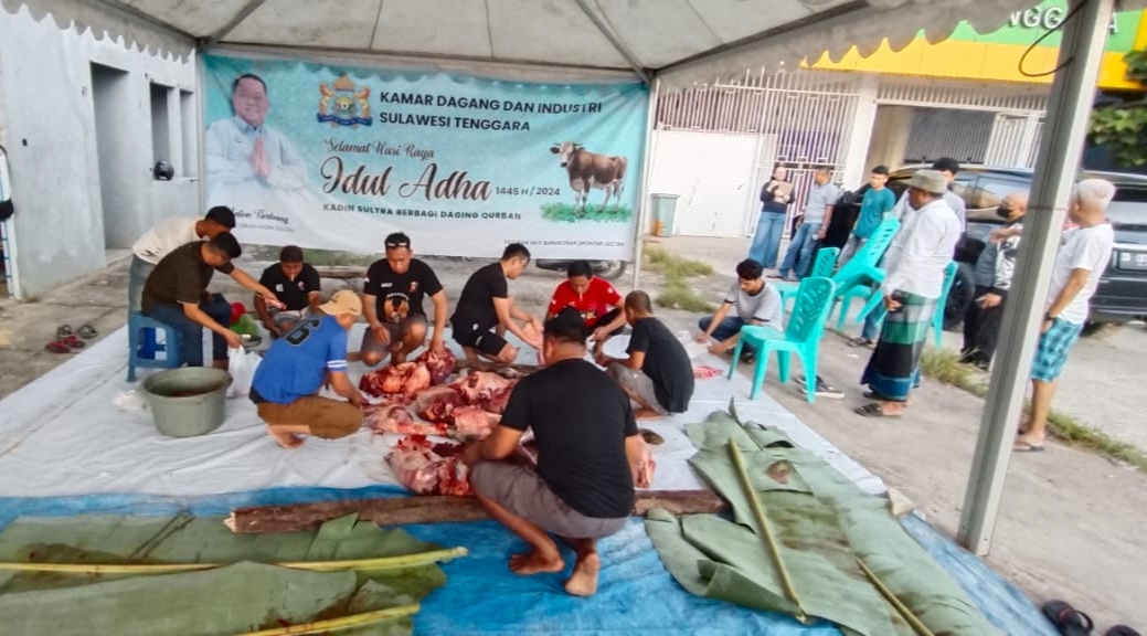 TINDO.ID| KENDARI – Momentum Hari Raya Iduladha 1445 Hijriah, Kamar Dagang dan Industri (Kadin) Sulawesi Tenggara (Sultra) menunjukkan kepedulian sosialnya dengan menyembelih tiga ekor sapi kurban untuk kemudian dibagikan kepada keluarga penerima manfaat di Kota Kendari.
