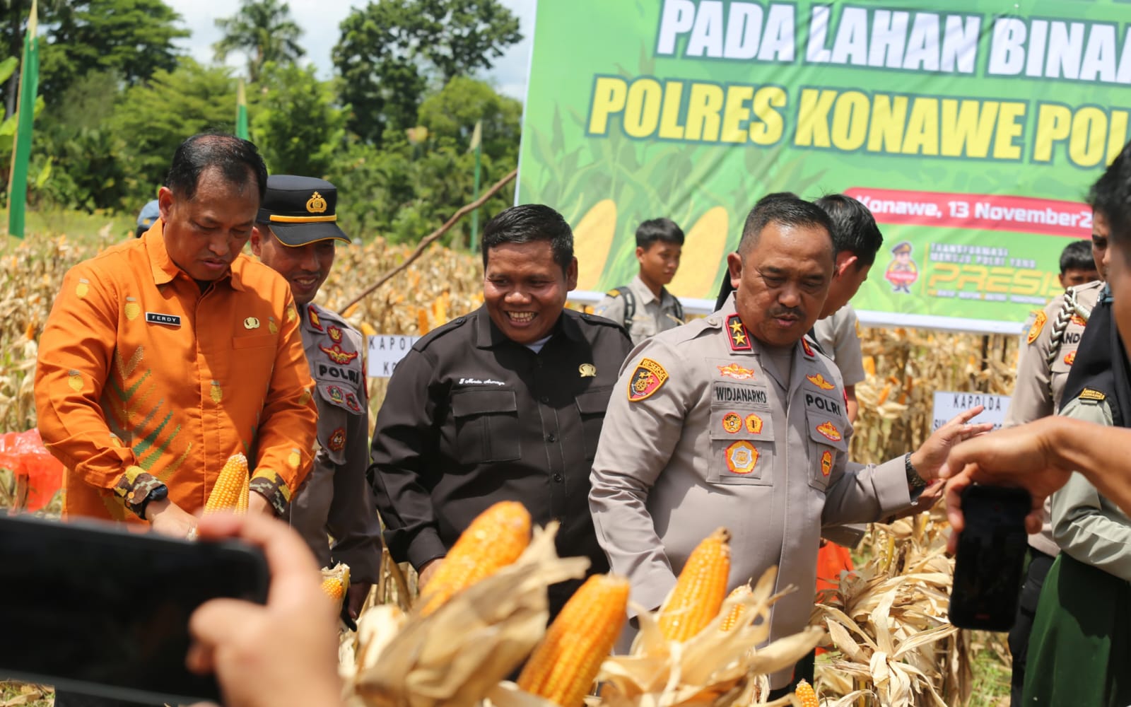 TINDO.ID | KONAWE – Kapolda Sulawesi Tenggara (Sultra) Irjen Pol Didik Agung Widjanarko, S.IK., M.H., bersama jajaran Pejabat Utama (PJU) Polda Sultra melaksanakan panen raya jagung kuartal IV tahun 2025 di lahan binaan Polri, Polres Konawe.