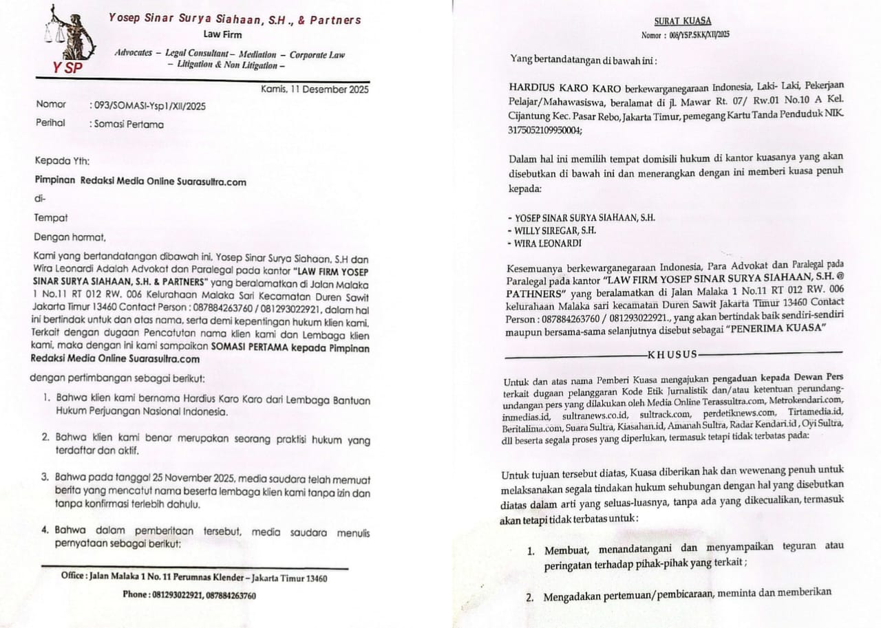 TINDO.ID | KENDARI – Menanggapi surat somasi Law Firm Yosep Sinar Surya Siahaan, S.H.& Partners Kuasa Hukum Hardius Karo Karo yang dikirimkan kepada awak media SUARASULTRA.COM.