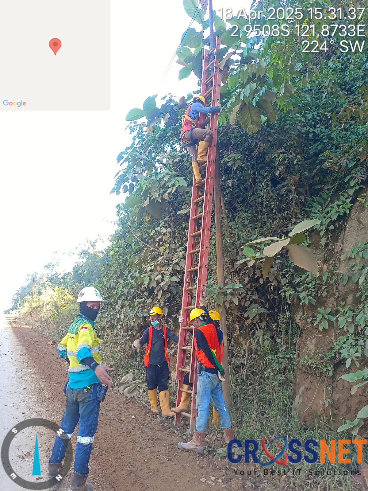 Penarikan kabel fiber optic melintasi jalur menantang hingga mencapai Routa, dengan dukungan infrastruktur tiang dan jaringan utama dari PLN Icon Plus.