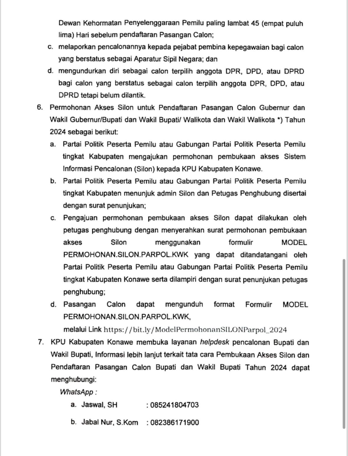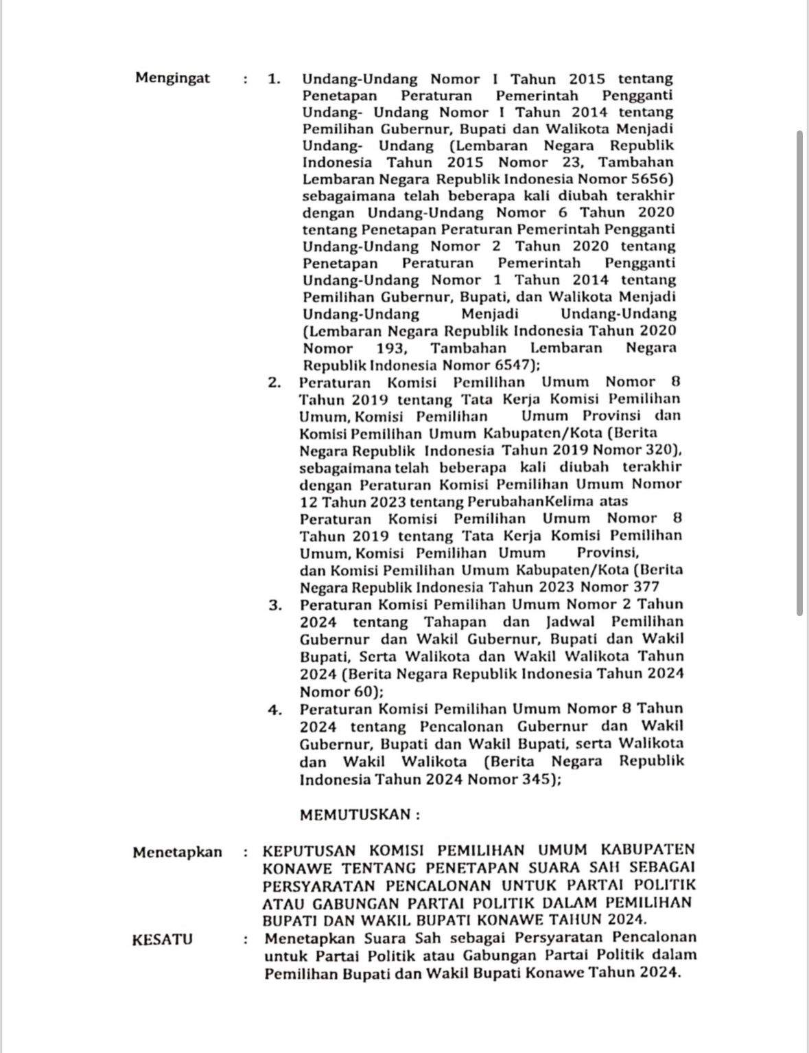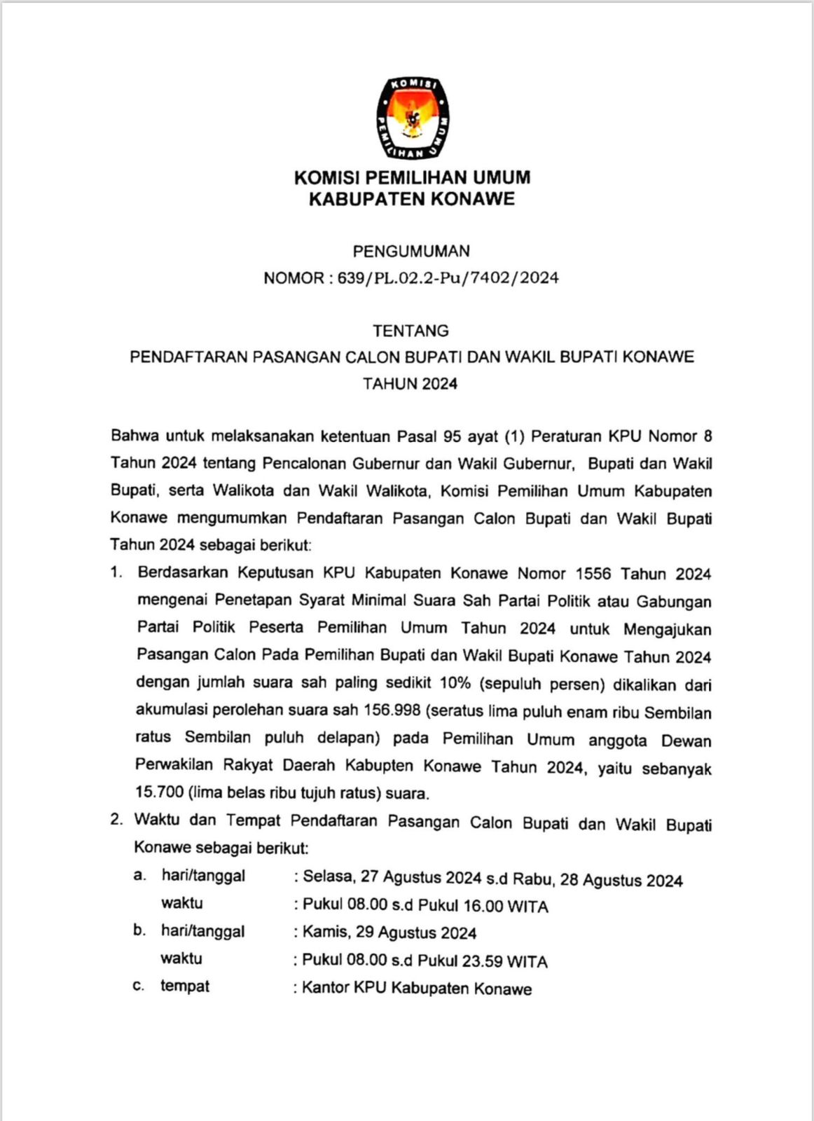 TINDO.ID | KONAWE – Komisi Pemilihan Umum (KPU) Kabupaten Konawe Provinsi Sulawesi Tenggara (Sultra) secara resmi mengumumkan jadwal pendataran bakal pasangan calon Kepala Daerah, Bupati dan Wakil Bupati Konawe periode 2024 – 2029.