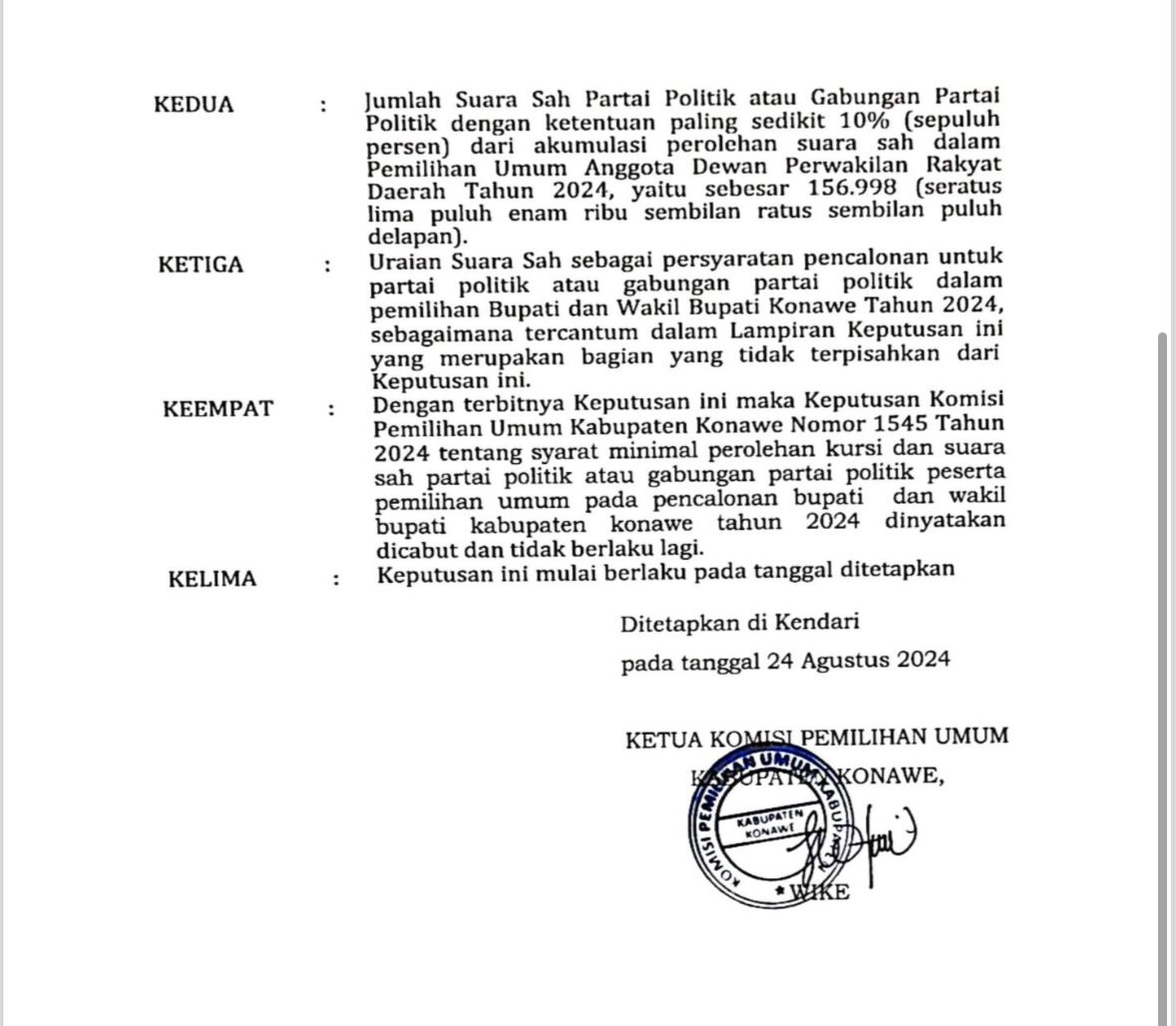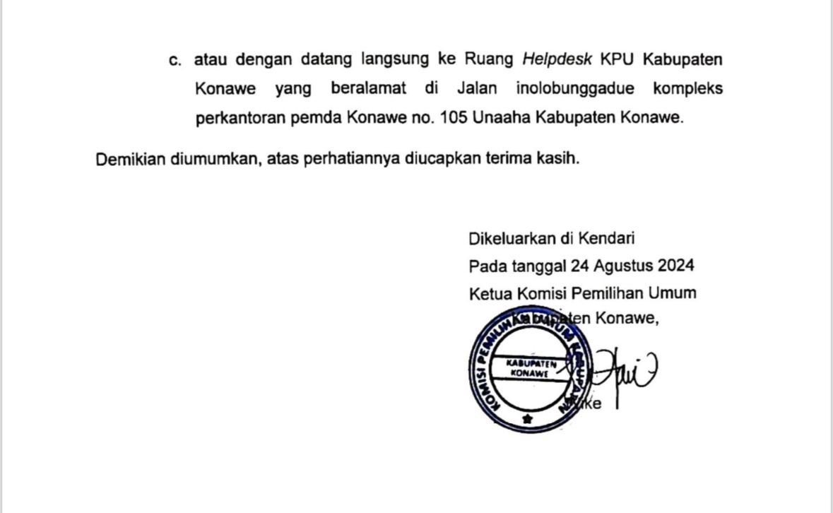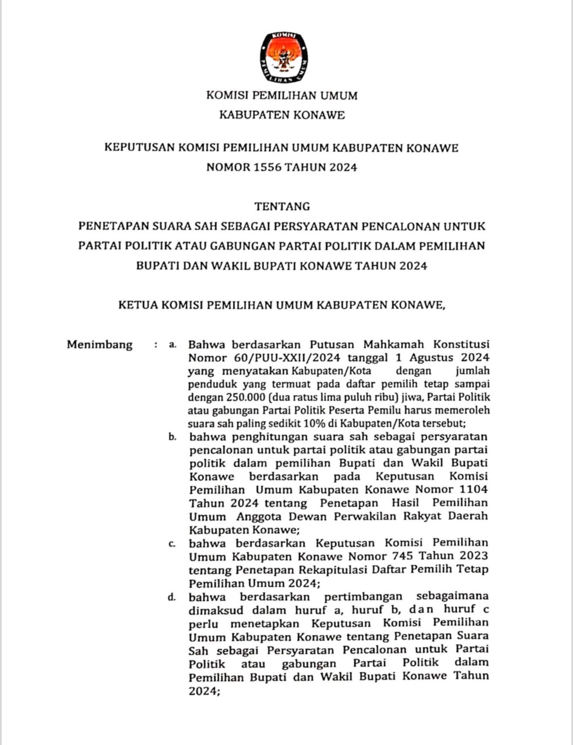 TINDO.ID | KONAWE – Komisi Pemilihan Umum (KPU) Kabupaten Konawe Provinsi Sulawesi Tenggara (Sultra) secara resmi mengumumkan jadwal pendataran bakal pasangan calon Kepala Daerah, Bupati dan Wakil Bupati Konawe periode 2024 – 2029.
