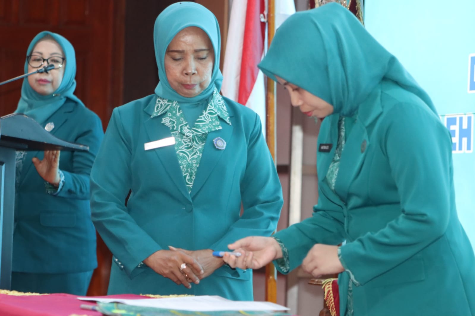 Ketgam: Ketua TP PKK Koltim Hartini Azis, A.Ma hendak menandatangani Berita Acara Pelantikan disaksikan PJ Ketua TP PKK Provinsi Sulawesi Tenggara, Dra. Munanah Asrun Lio. Foto: Istimewa