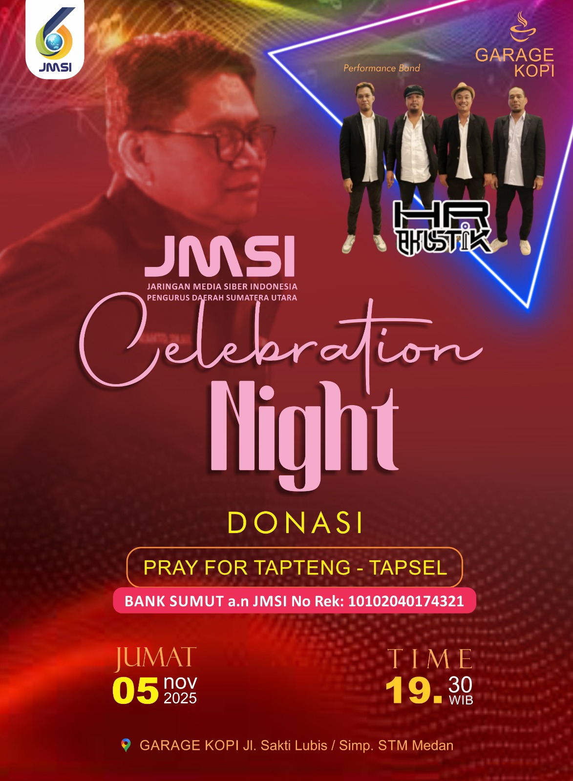 TINDO.ID | MEDAN – Jaringan Media Siber Indonesia (JMSI) Sumatera Utara menginisiasi kegiatan Pray for Bencana Sumut melalui gelaran Konser Musik HR Akustik bertajuk “Celebration Night” yang akan digelar di Garage Kopi, Jalan STM/Simpang Sakti Lubis, pada Jumat malam, 5 Desember 2025.