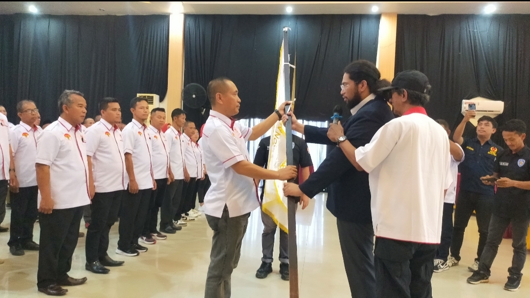 Ketgam: Ketua KONI Sultra Alvian Topan Putra menyerahkan Bendera Pataka kepada Ketua KONI Kabupaten Konawe Rusdianto, Selasa 27 Februari 2024.