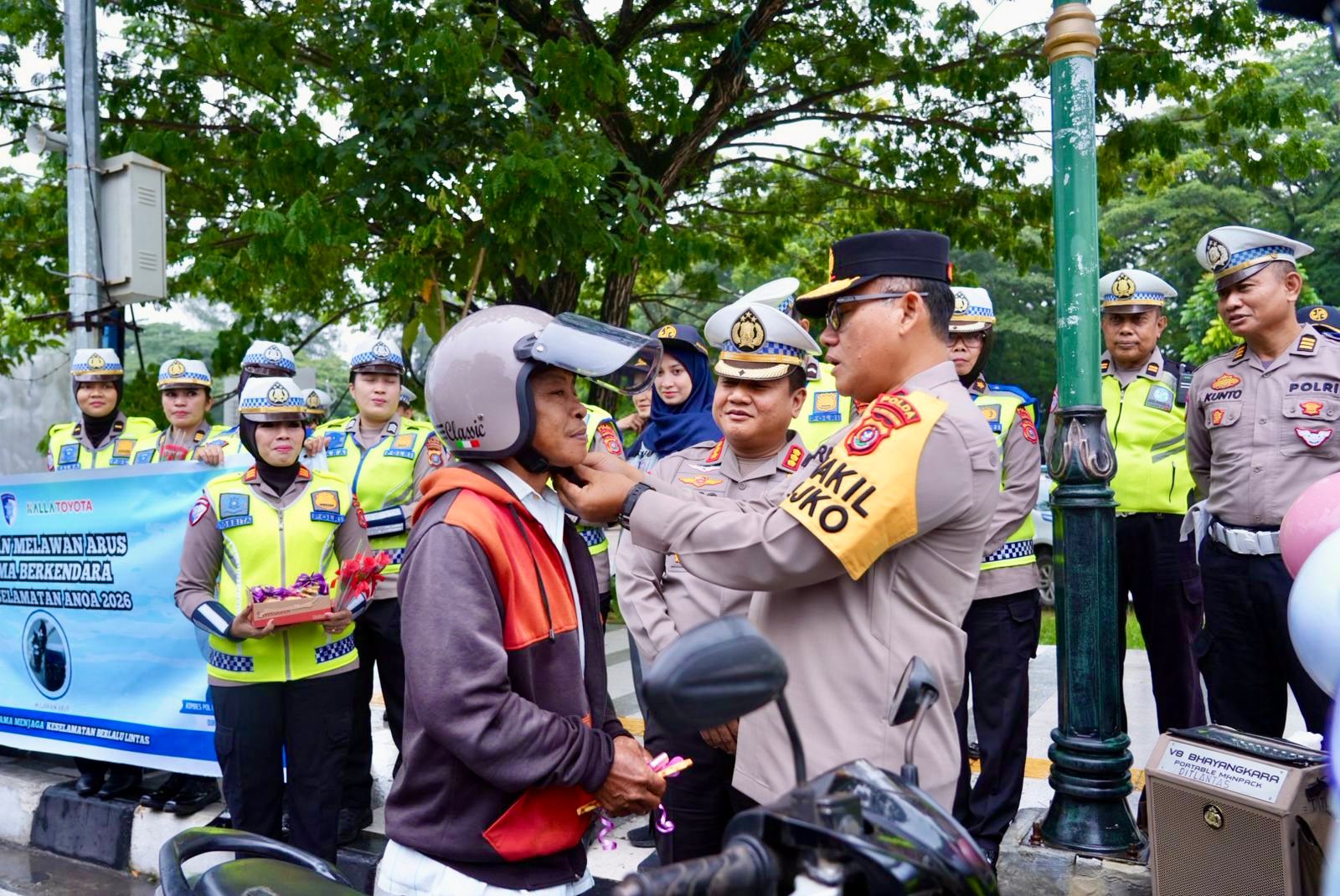 Pengendara yang kedapatan tidak menggunakan helm sesuai ketentuan diberikan helm secara cuma-cuma sebagai wujud kepedulian Polri terhadap keselamatan masyarakat di jalan raya.
