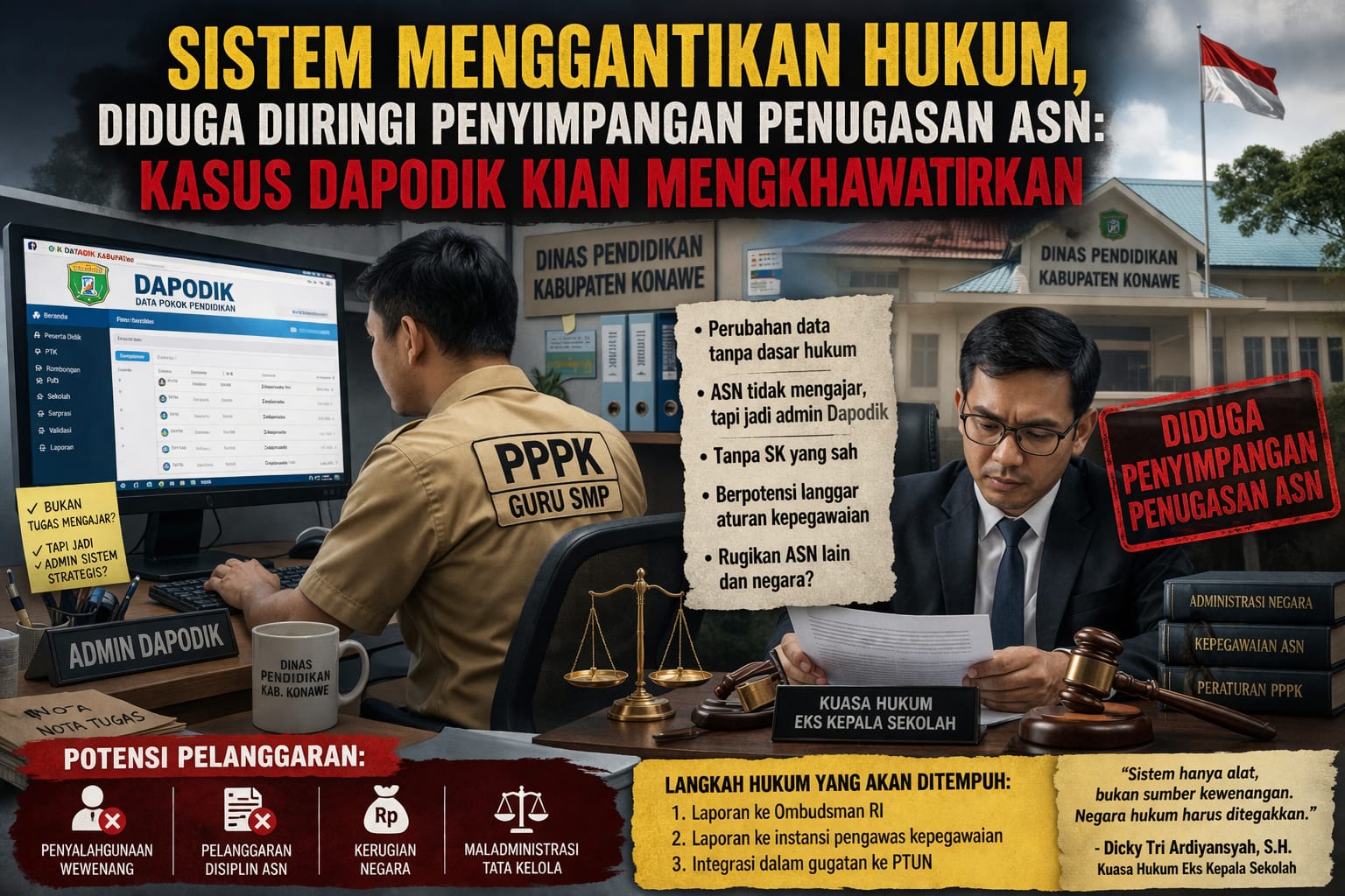 Kuasa hukum para eks kepala sekolah, Dicky Tri Ardiyansyah, S.H, mengungkapkan adanya temuan yang mengindikasikan pengelolaan admin Kelompok Kerja Data Pendidikan (KK Datadik) atau Dapodik tingkat kabupaten diduga dilakukan oleh seorang ASN berstatus Pegawai Pemerintah dengan Perjanjian Kerja (PPPK).