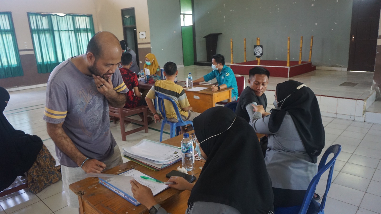Tim kesehatan dari Puskesmas yang terdiri dari dokter, perawat, dan tenaga medis lainnya melakukan berbagai pemeriksaan, termasuk cek tekanan darah, pemeriksaan gula darah, pemeriksaan umum kondisi fisik, serta konsultasi kesehatan.