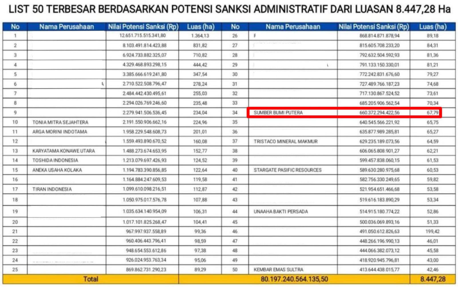 Berdasarkan data yang dihimpun, PT SBP berpotensi dijatuhi denda administratif sebesar Rp660.372.294.422,56 atau lebih dari Rp660 miliar. Sanksi tersebut diduga berkaitan dengan aktivitas pertambangan yang memasuki kawasan hutan seluas 67,79 hektare.