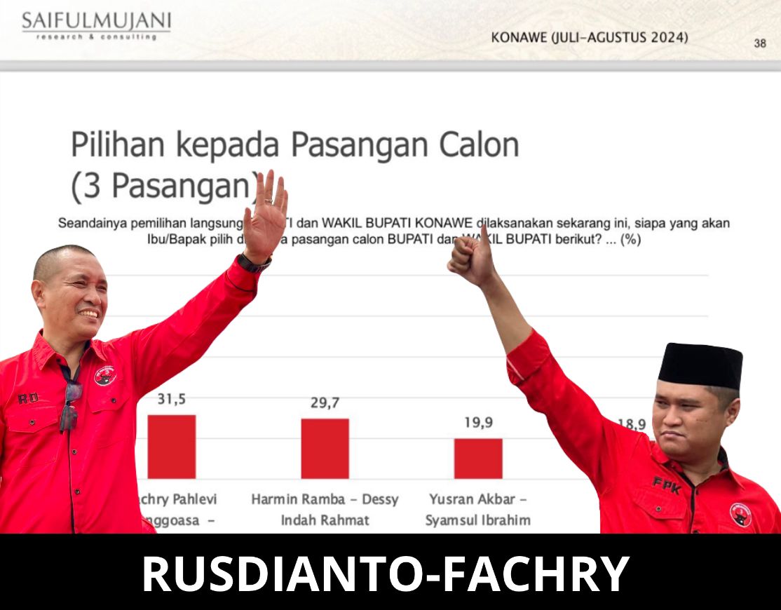 Survei terbaru yang dikeluarkan Saiful Mujani Research and Consulting (SMRC) yang dilakukan Juli-Agustus 2024 terkait paslon dalam Pilkada Konawe, menunjukan jika pesona seorang Fachry tampak masih lebih unggul dibanding tiga paslon lainnya.
