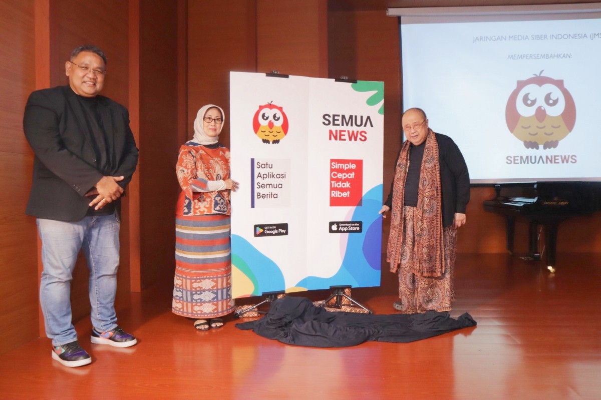 Peluncuran SemuaNews dilakukan Ketua Umum JMSI Teguh Santosa, didampingi Ketua Dewan Pers Ninik Rahayu dan budayawan Jaya Suprana.